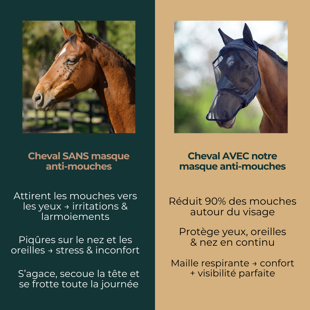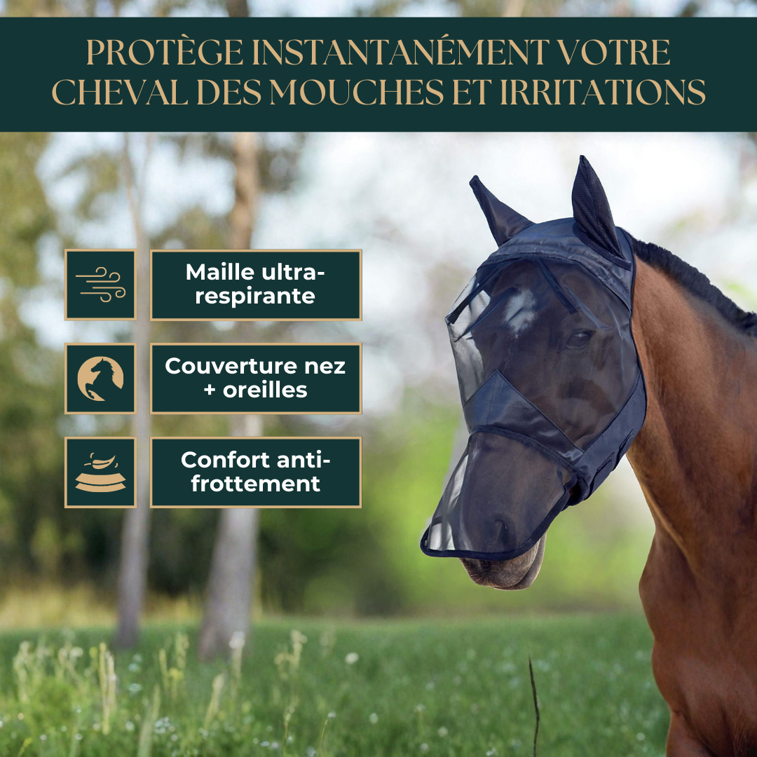 Un simple ajustement, et tout change : un cheval plus calme, plus détendu, enfin libéré de l’agacement permanent causé par les mouches. Le confort est irréprochable, la visibilité reste impeccable — une amélioration si nette qu’elle en devient incontournable.